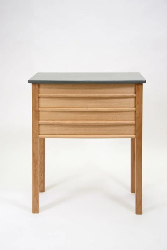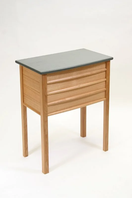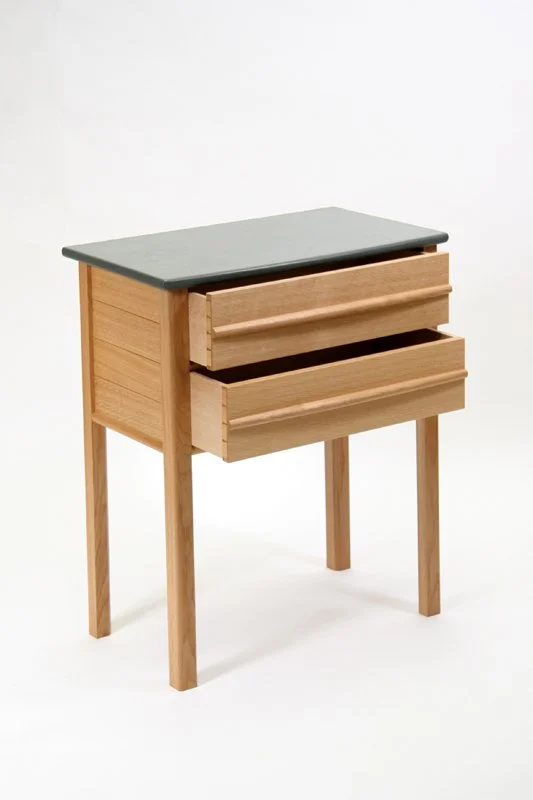 Description : This piece was made as a companion piece to the SB console. It was commissioned to sit in the same room but in a smaller space. Rather than just making a narrower version which would not have worked proportionally, I created a new piece with two deeper drawers. The styling matches that of the original console with the side and front angled out by one degrees to give the piece a solid stance.